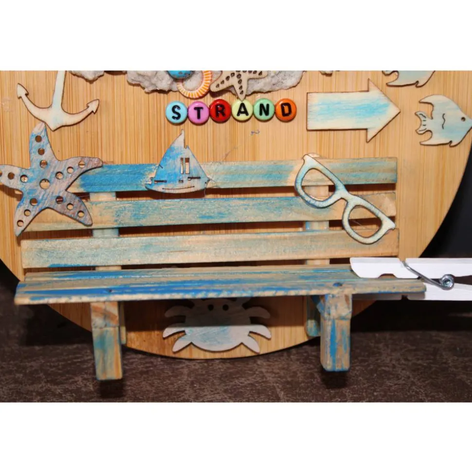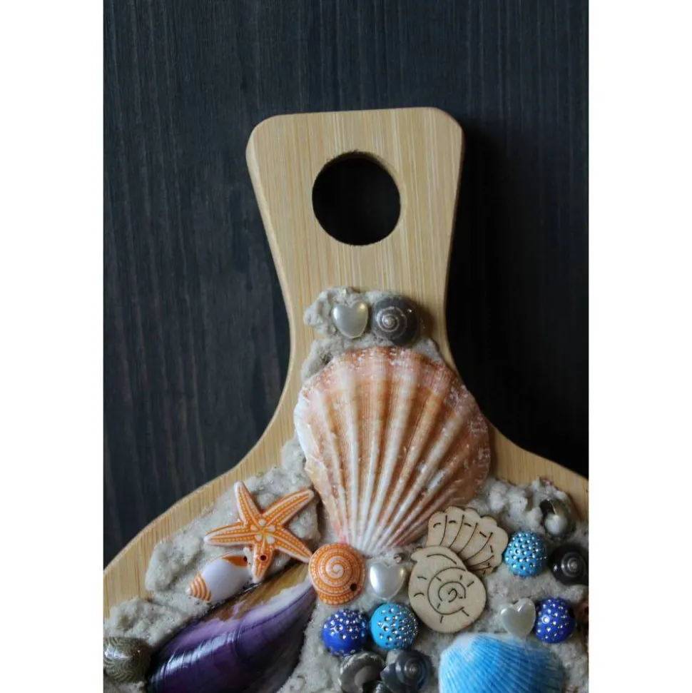 Dekoriert mit Muscheln, Holzornamenten, Kunststoffperlen, Sand und vielem mehr.