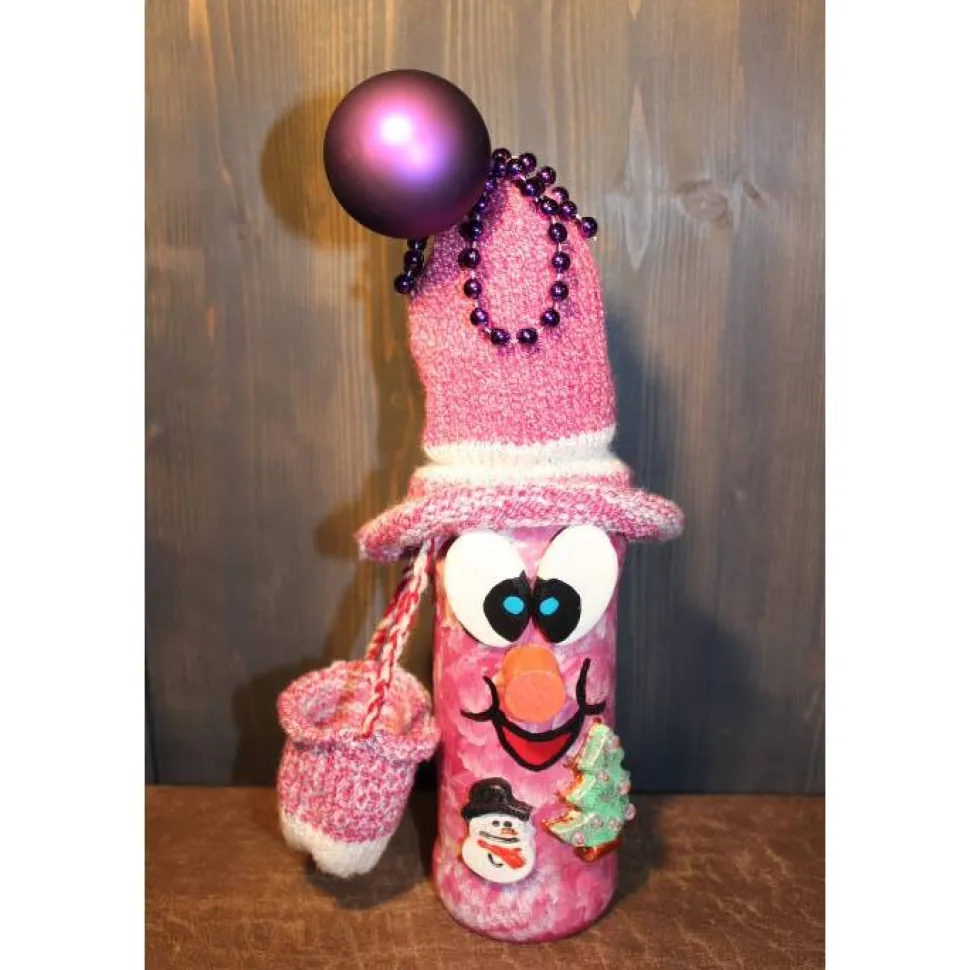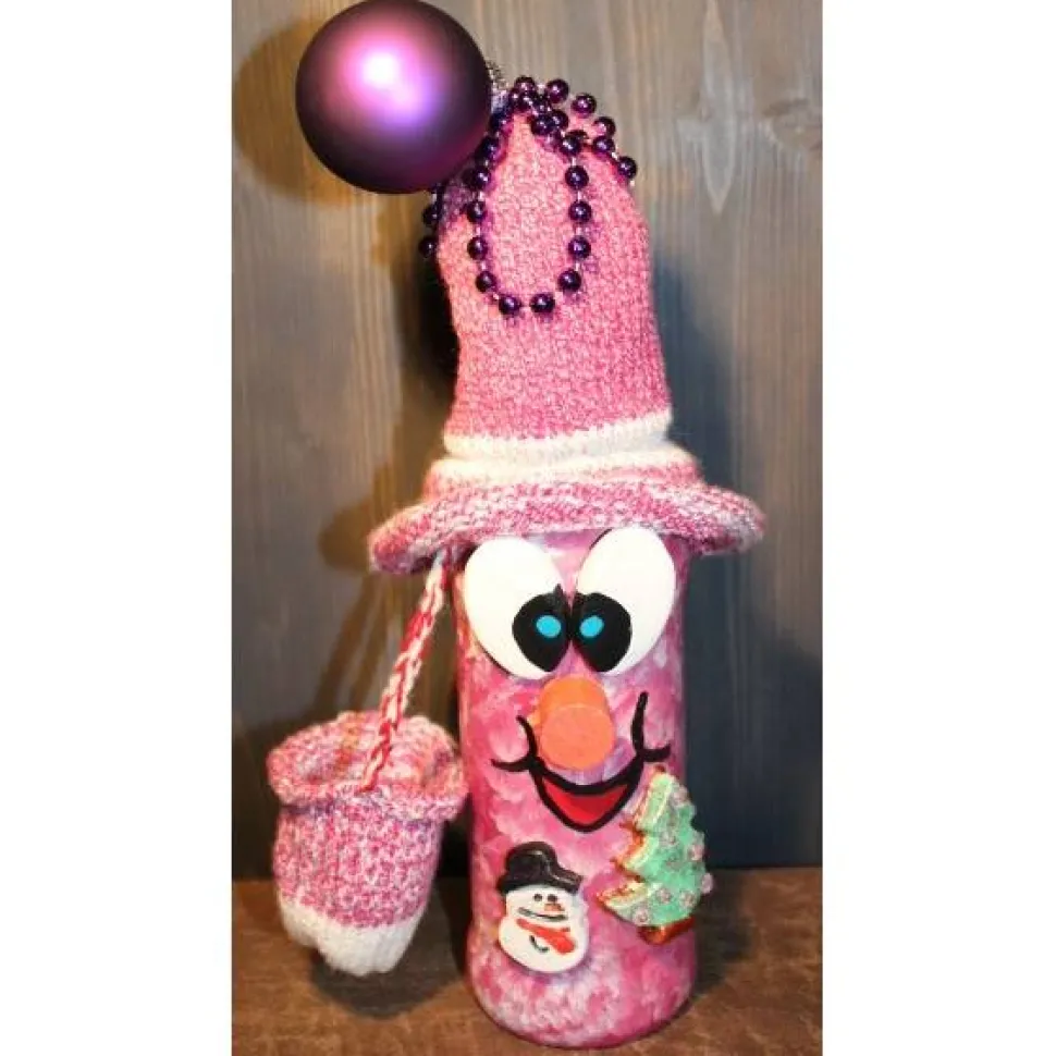 Weihnachtswichtel aus einer Weintflasche. Witziges Upcycling-Projekt, gestaltet mit Acrylfarbe und einem handgestrickten Wollmützchen. Verziert mit Schneemann und Tannenbaum aus Ton, viel Glitter, Weihnachtskugel und Perlenkette. Lustige Dekofigur für die Herbst- und Weihnachtszeit. Kann auch als Geldgeschenk verwendet werden indem man einen Geldschein in der Tasche platziert.