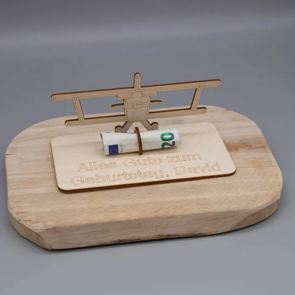 Geldgeschenk Doppeldecker Flugzeug - aus Holz personalisiert