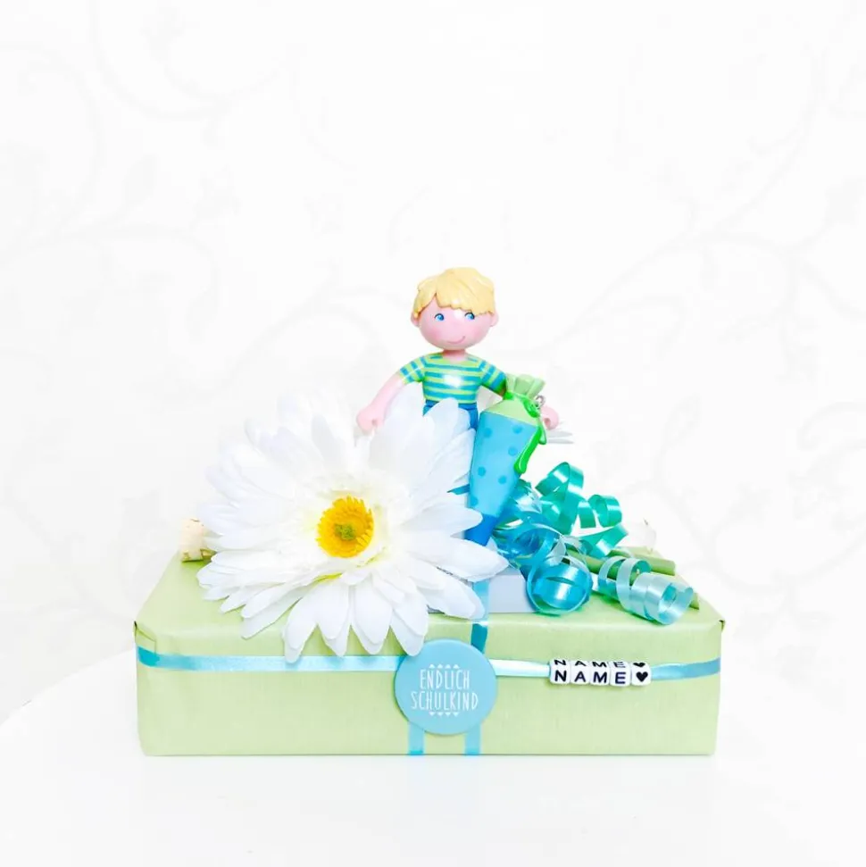 Gleichzeitig ist das Geldgeschenk aber mit ein paar kleinen, liebevollen Geschenken kombiniert: ein Button „Endlich Schulkind“, einer Little Friends Figur und einer Box mit Zahlenmagneten für angehende Rechenkünstler. Personalisiert wird das ganze dann noch mit Buchstabenperlen gut sichtbar vorne auf dem Geschenk. Individuell, persönlich und von Herzen.