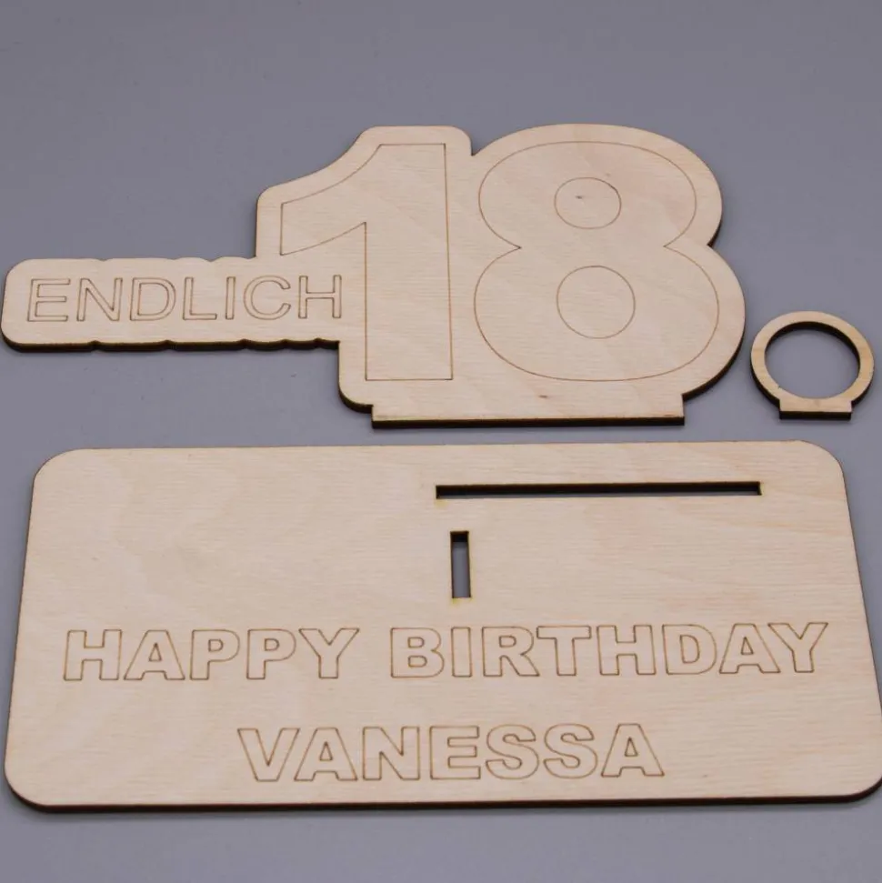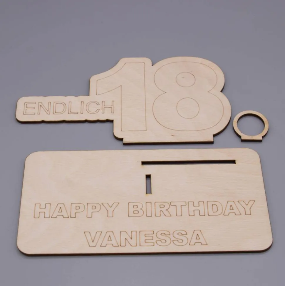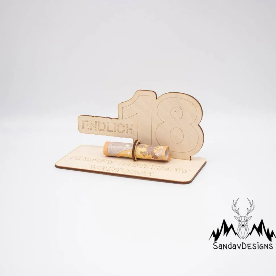 Geldgeschenk Endlich 18 – aus Holz personalisiert