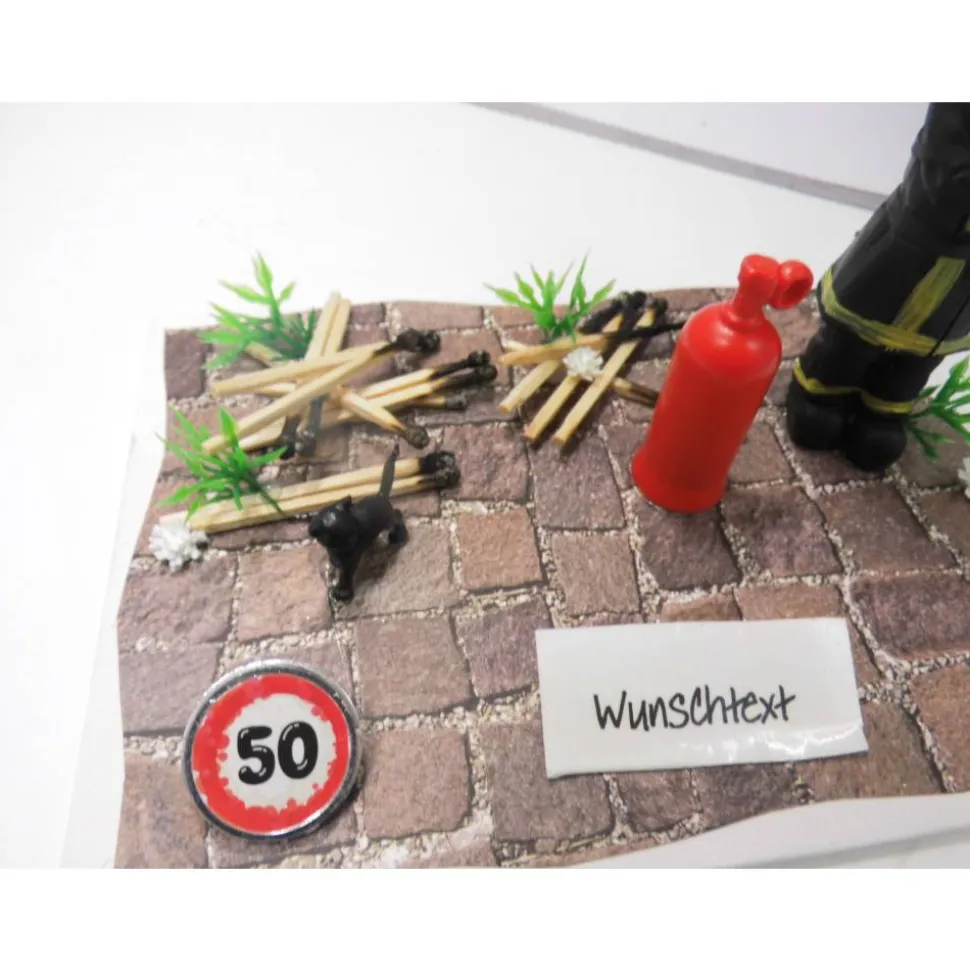 Der Feuerwehrmann als Hauptakteur wird von einem kleinen Feuerlöscher, Gras, Blüten, einem Marienkäfer als Glücksbringer und einer geretteten Katze begleitet. Detailverliebt sorgen abgebrannte Streichhölzer für einen authentischen Look – hier kannst du den Geldschein einfach zwischen die Streichhölzer schieben. Die Zahl im Vordergrund, z.B. 50, ist individuell anpassbar für runde Geburtstage oder Jubiläen.