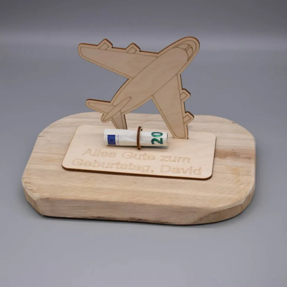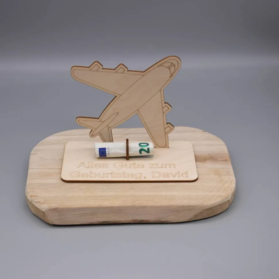 Unser Geldgeschenk aus 3 mm Birkensperrholz bietet nicht nur eine stilvolle Präsentation für Geldscheine, sondern kann auch als dekoratives Element in jedem Zuhause dienen. Es kann an der Wand aufgehängt oder auf einem Regal platziert werden, um eine wunderbare Erinnerung an den besonderen Anlass zu schaffen.