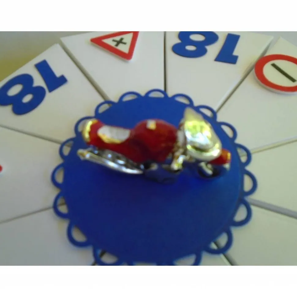 verziert habe ich diese Torte mit einem kleinen Motorrad,gestanzte 18, Verkehrszeichen,Band