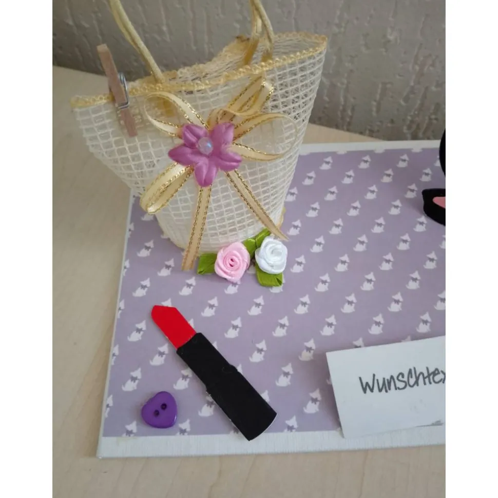 Platziere deinen Geldschein oder Gutschein direkt in der dekorativen Handtasche. Ein Lippenstift, Nagellack oder eine süße Überraschung passen ebenfalls hinein und machen das Geschenk zu einem echten Blickfang.