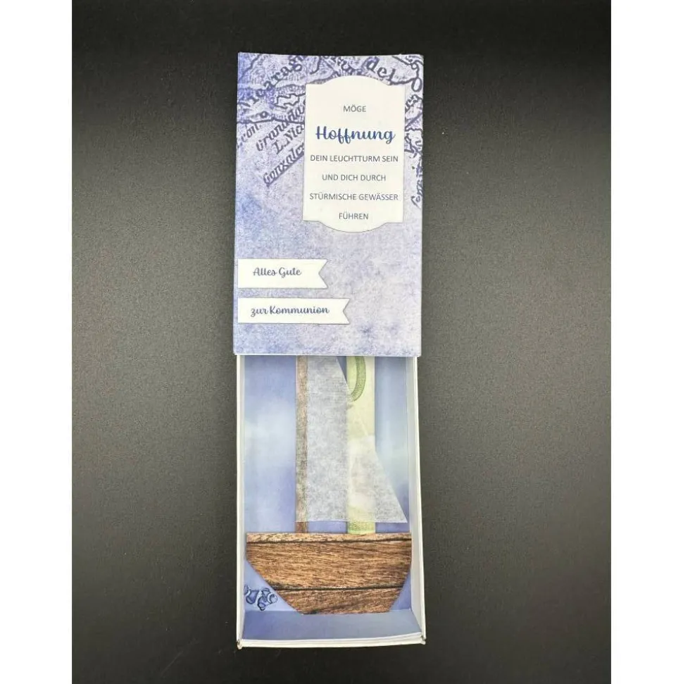 Das Außenteil der Schiebebox wurde mit blauem Designpapier in Landkartenoptik beklebt. Außerdem wurde ein schöner Kommunionspruch und „Alles Gute zur Kommunion“ angebracht.