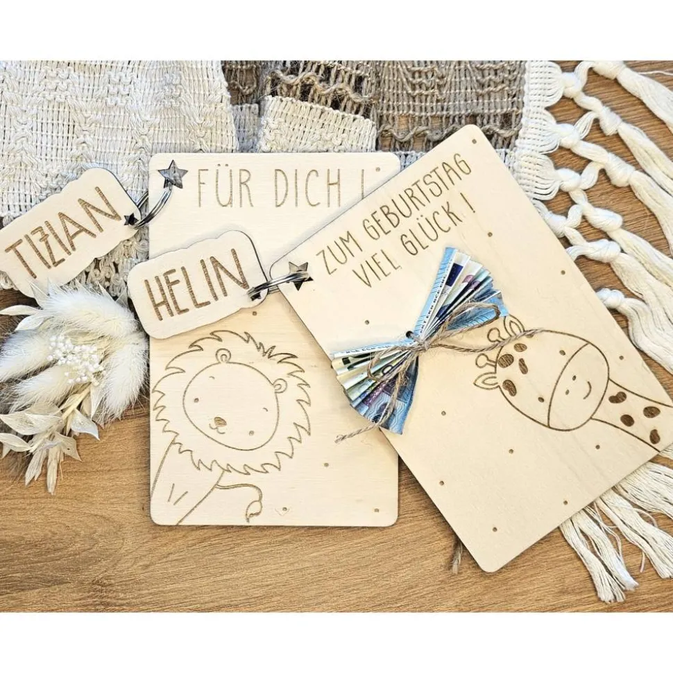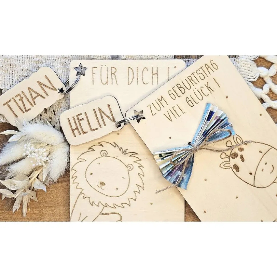 Karte und Schlüsselanhänger werden aus 4mm Pappelholz, mit einem Laser ausgeschnitten und mittels Lasergravur nach euren Wünschen personalisiert.