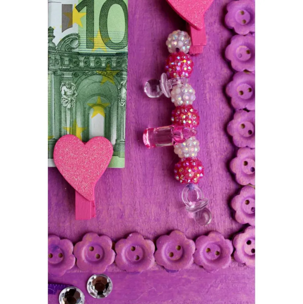 Auf Holz gestaltete Collage für die Geburt eines Mädchens. Mit Knöpfchen, Klammern Glitzersteinen und Stoff verziert. Bemalt mit Acrylfarben.