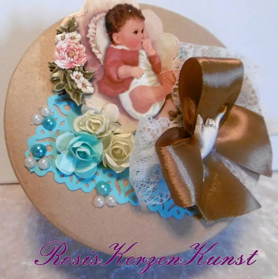 Wir haben eine runde Geschenkebox aus stabiler Kraftpapierpappe mit edlem Designpapier, einem 3-D Motivaufleger, Perlen, Spitzen-und Satinband und künstlichen Röschen dekoriert. Auf der Satinschleife ist mittig noch ein kleiner niedlicher, fliegender Storch aufgebracht