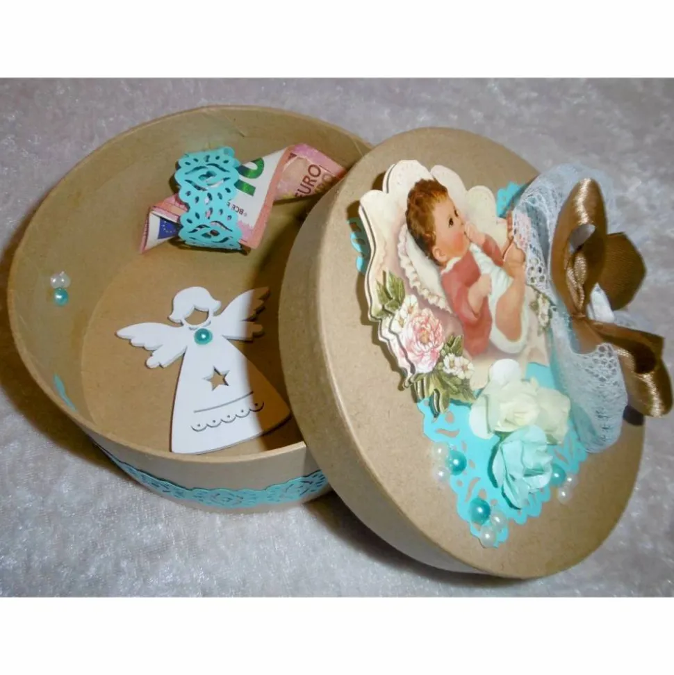 Das Innere der Box ist mit einem weissen Schutzengelchen aus Holz versehen. An der einen Seite der Box ist eine kleine türkisfarbene Schlaufe aus Designpapier angebracht, in die Sie das zugedachte Geldgeschenk plazieren können.
