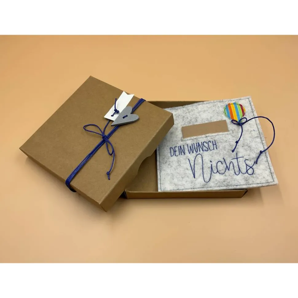 Die bestickte Filzkarte mit Einschub für Geld oder eine Botschaft, oder Beides! eignet sich besonders für Menschen die keinen speziellen Wunsch geäußert haben,