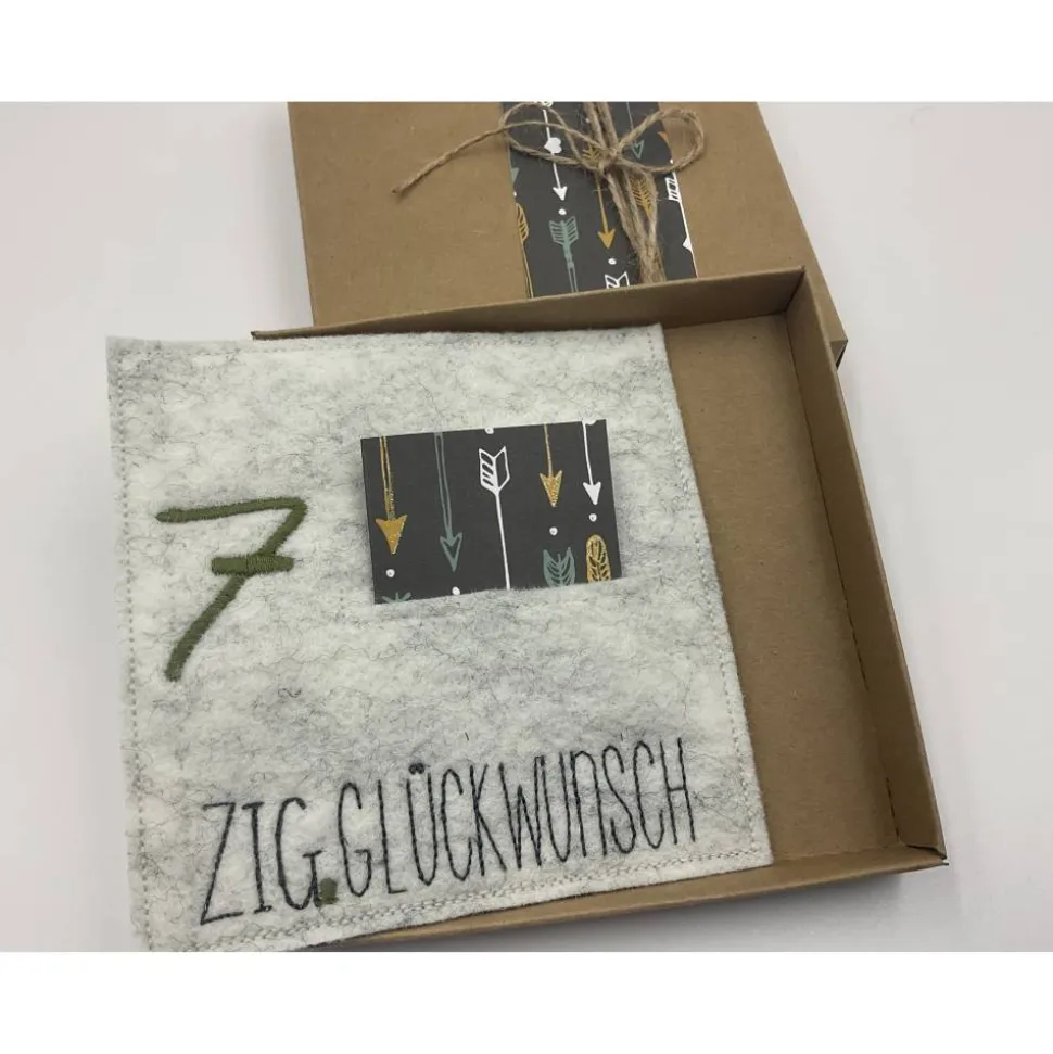 Im Inneren eine bestickte Filzkarte mit seitlichem Einschub für Geld oder eine Botschaft, oder Beides!