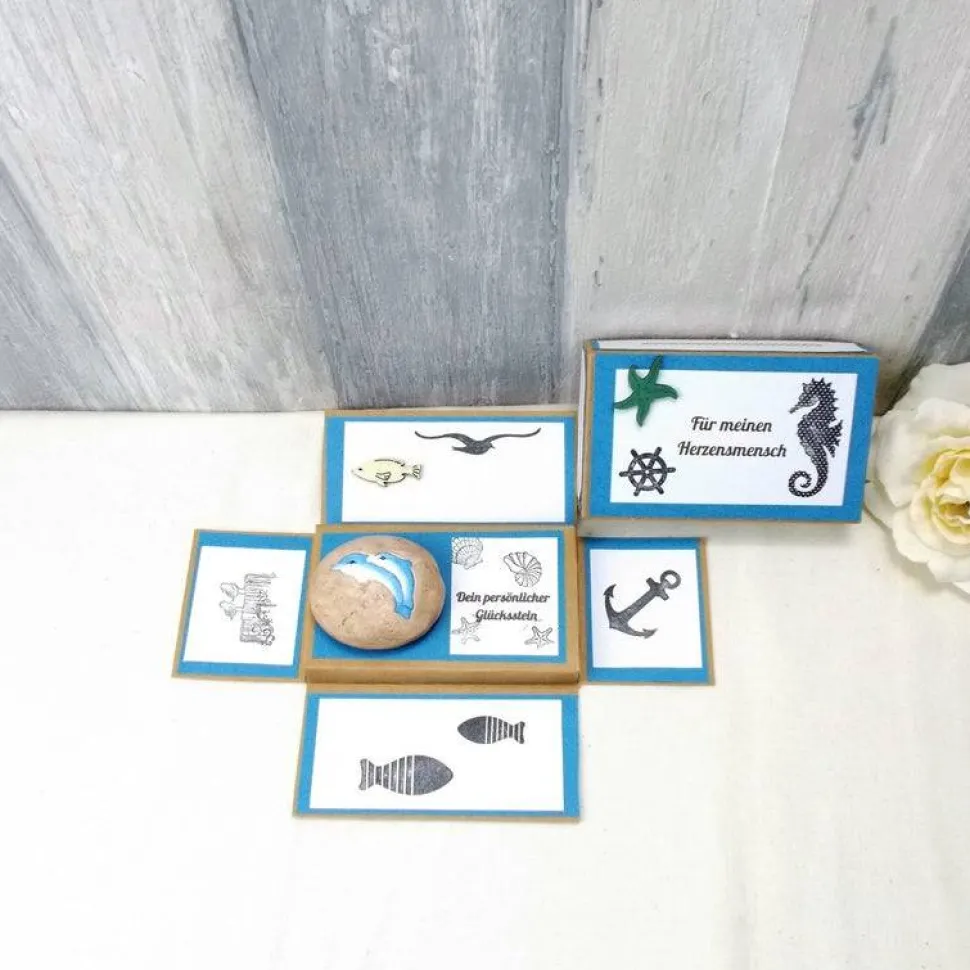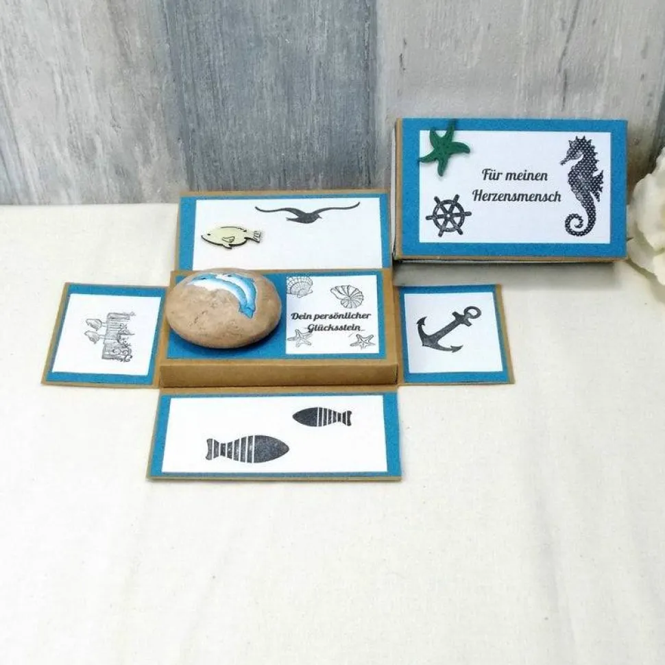 Der Stein hat auf der Vorderseite zwei süße Delfine als Glücksbringer.