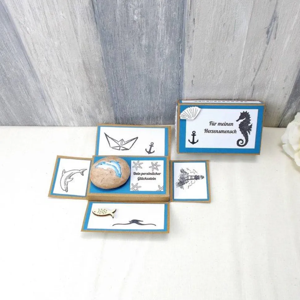 Der Stein hat auf der Vorderseite zwei süße Delfine als Glücksbringer.