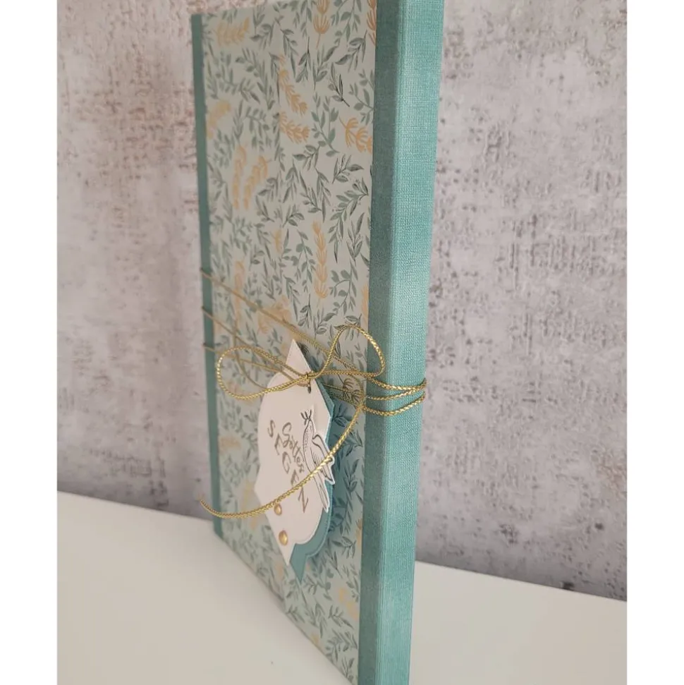 Die Buchkarte ist in den Farben Lagunenblau und Gold gehalten und ist außen mit einem Goldband umwickelt an dem ein Etiketten angebracht ist.