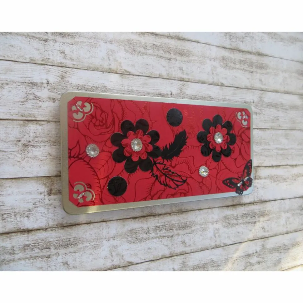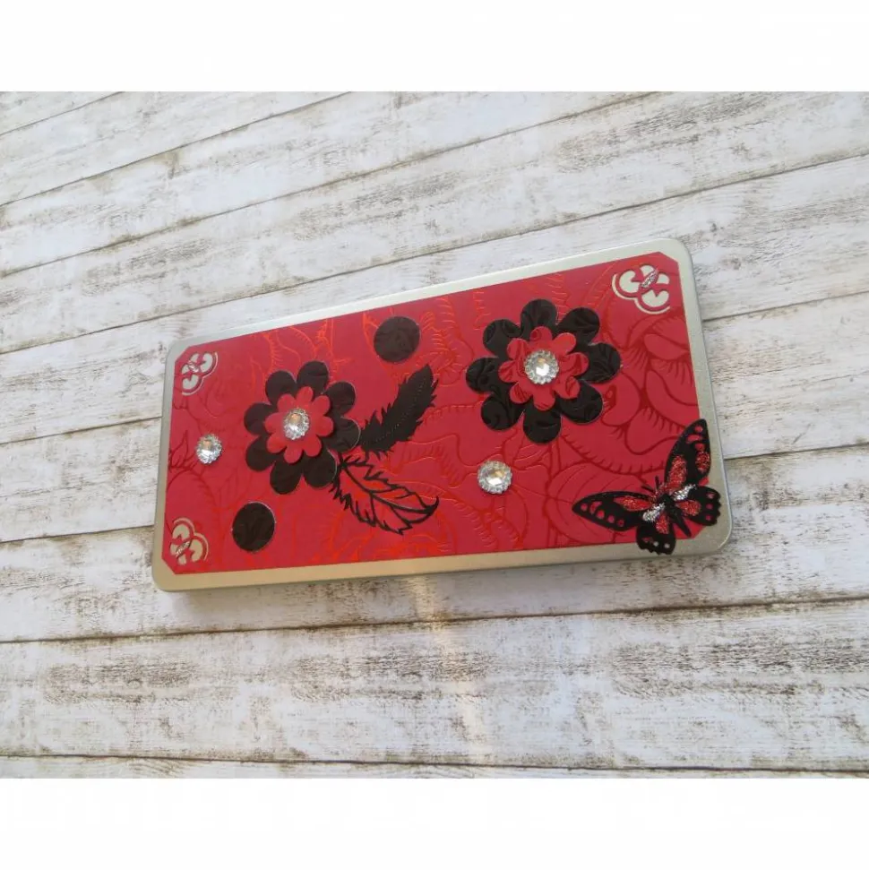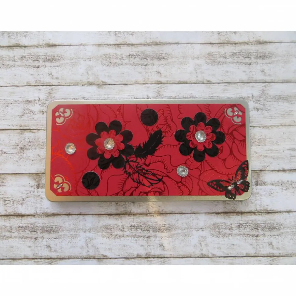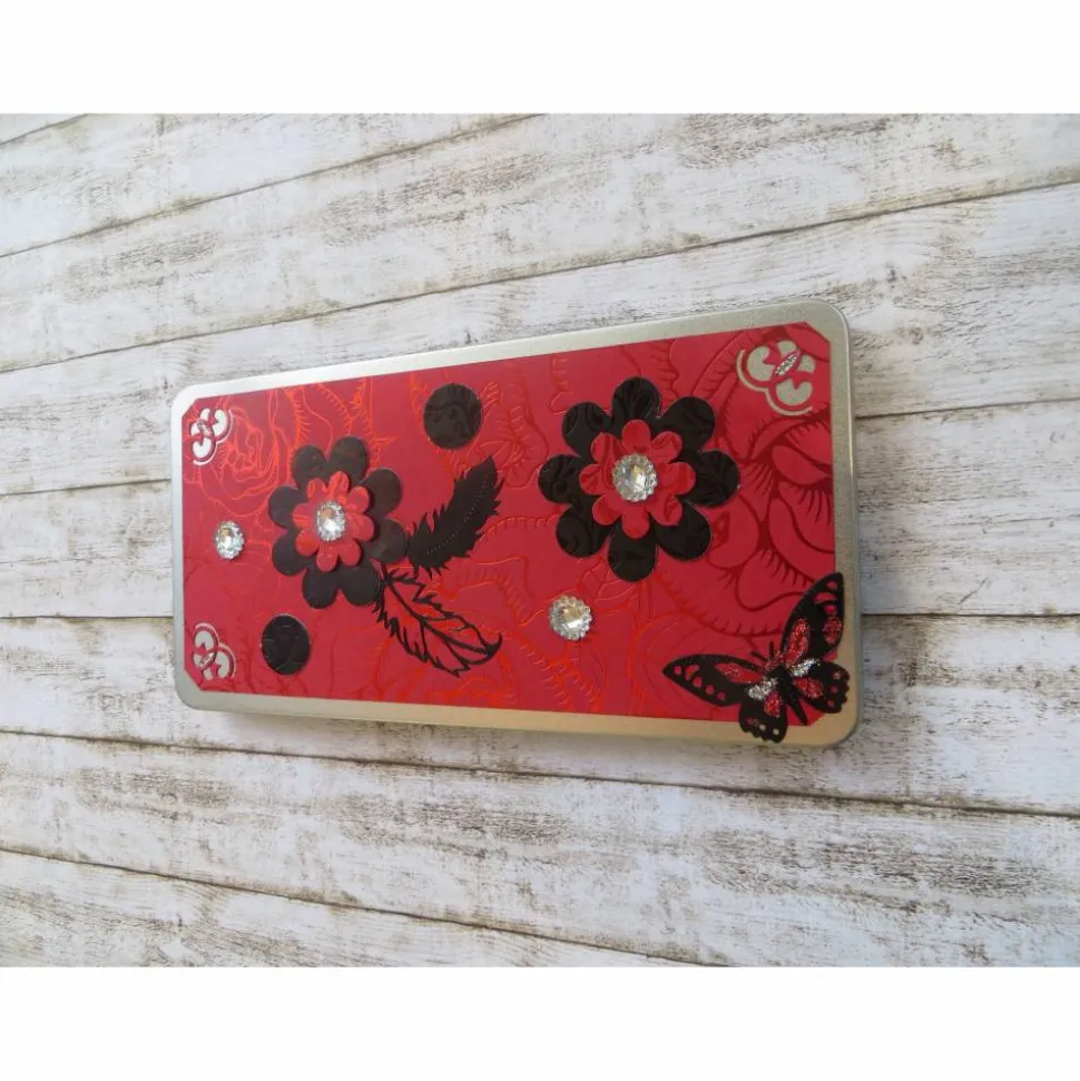 Die Geldgeschenkverpackung, Dose, Gutscheinverpackung ist mit hochwertigem bedrucktem Kartenkarton, Blumendekor, Glitzersteinchen und Stanzelementen verziert.
