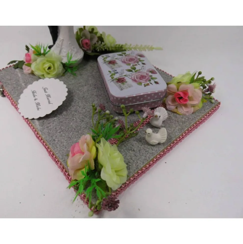 Entdecke die ideale Alternative zur klassischen Geschenkverpackung: Dieses Geldgeschenk für das Brautpaar vereint Eleganz und Individualität. Die liebevoll gestaltete Dekoration ist auf einer Platte mit den Maßen von ca. 16 x 21 cm befestigt und wird durch kleine, sorgfältig ausgewählte Accessoires ergänzt. Besonders edel wirken die zarten rosa Rosen, die nicht nur zur Hochzeit, sondern auch perfekt zur Rosenhochzeit passen.