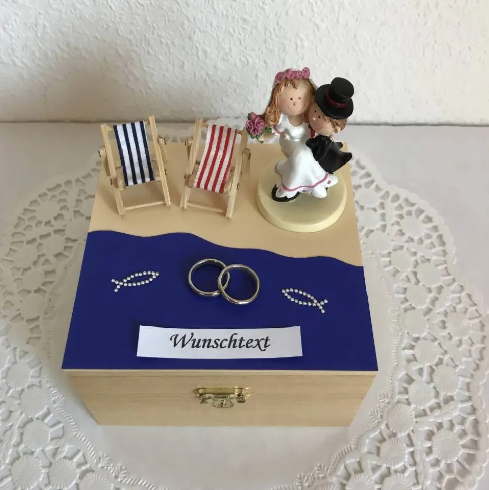 Als Hochzeitsgeschenk wünscht sich das Brautpaar Geld für die Flitterwochen? Mit diesem zauberhaften Geschenk ist das Geld wundervoll verpackt. Auch ein Gutschein lässt sich im Inneren der hübschen Holzbox problemlos verstauen. Die maritime Szene mit Strand, Meer und Sonne lädt zum Träumen ein. Selbst glitzernde Fische tummeln sich im Wasser. Und das Beste: sogar Ihr Wunschtext findet seinen Platz. Ein weiteres Highlight ist, dass das Geldgeschenk als Erinnerungsbox weiter verwendet werden kann, denn: in der Schatulle lassen sich Erinnerungen an die Flitterwochen, den Strandurlaub und die Reise liebevoll aufbewahren.