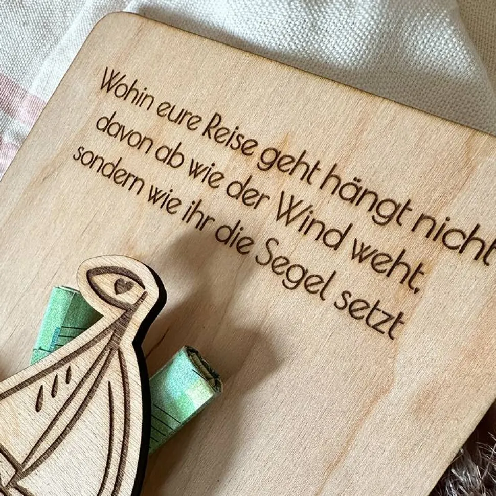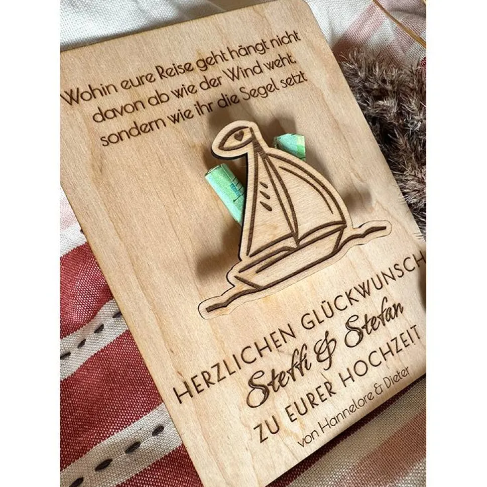 Die Holzkarte ist eine wunderschöne Möglichkeit Geldscheine zu überreichen und eine einzigartige Erinnerung für das Brautpaar.