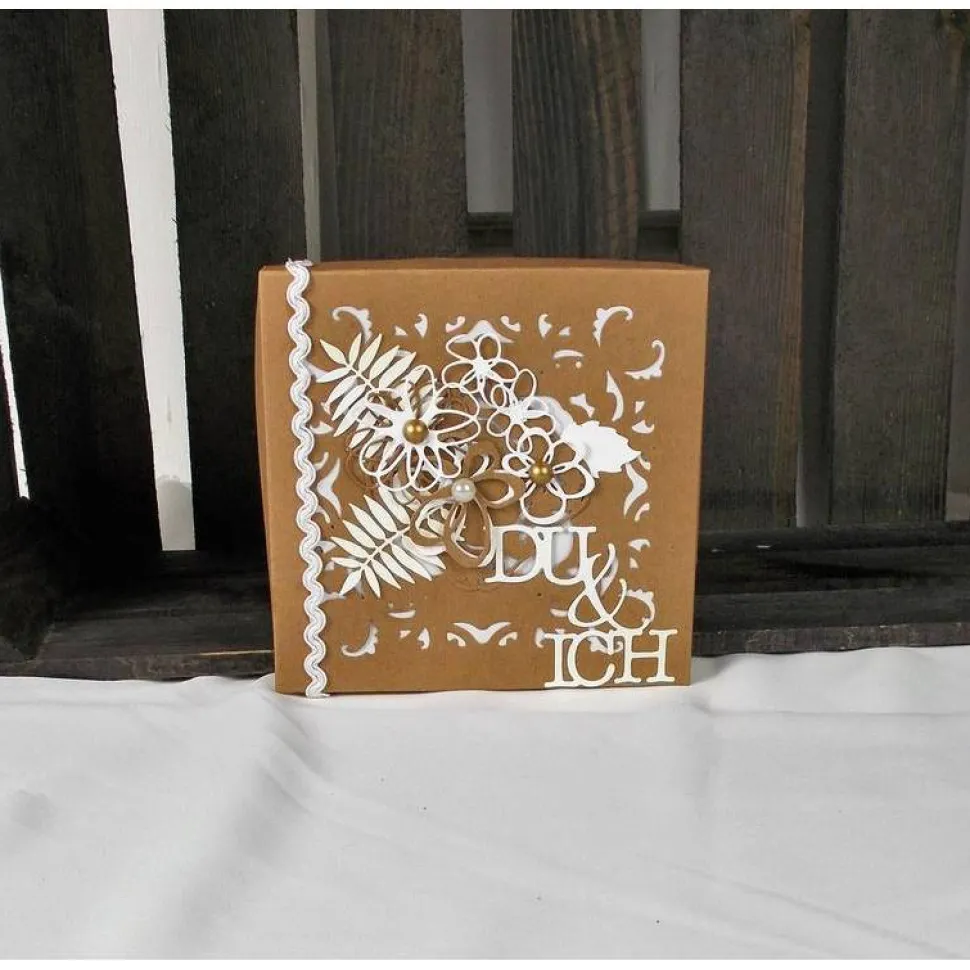 Edle Box in Naturtönen und weiß, der Deckel wurde üppig mit Ausstanzungen und Blüten dekoriert. Rechts unten wurde der Schriftzug „Du und Ich „aufgesetzt.