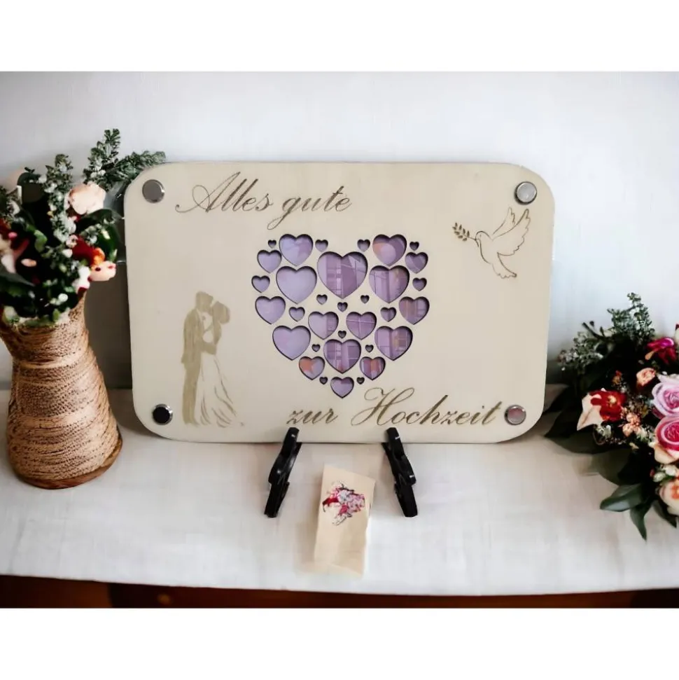 Unsere handgefertigte Sperrholz-Karte, präzise geschnitten durch modernste Lasertechnik, verleiht eurem Geldgeschenk für die Hochzeitskasse eine einzigartige kreative Note. Personalisierbar mit individuellen Botschaften wird diese Karte zum stilvollen Blickfang, der lange in Erinnerung bleibt. Vielseitig einsetzbar als Geldgeschenk, dekoratives Element, Grußkarte oder personalisiertes Kunstwerk – das absolute Must-Have für jede Hochzeitsfeier! Erlebt jetzt, wie eure Geste zu einem unvergesslichen Hochzeitshighlight wird. Sichert euch dieses einzigartige Geschenk, das garantiert Eindruck hinterlässt!