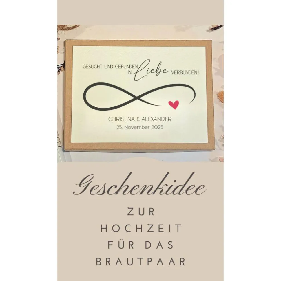 Die Box wird mit dem Namen des Brautpaares sowie dem Hochzeitsdatum personalisiert und besticht durch ihr elegantes Infinity-Zeichen. Ein Baumwollsäckchen bietet Platz für dein Geldgeschenk oder kleine Aufmerksamkeiten. Zusätzlich liegt eine Karte für persönliche Glückwünsche bei.