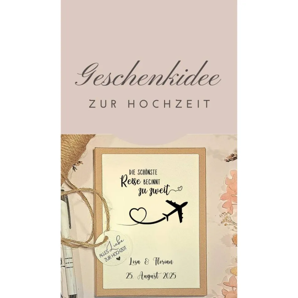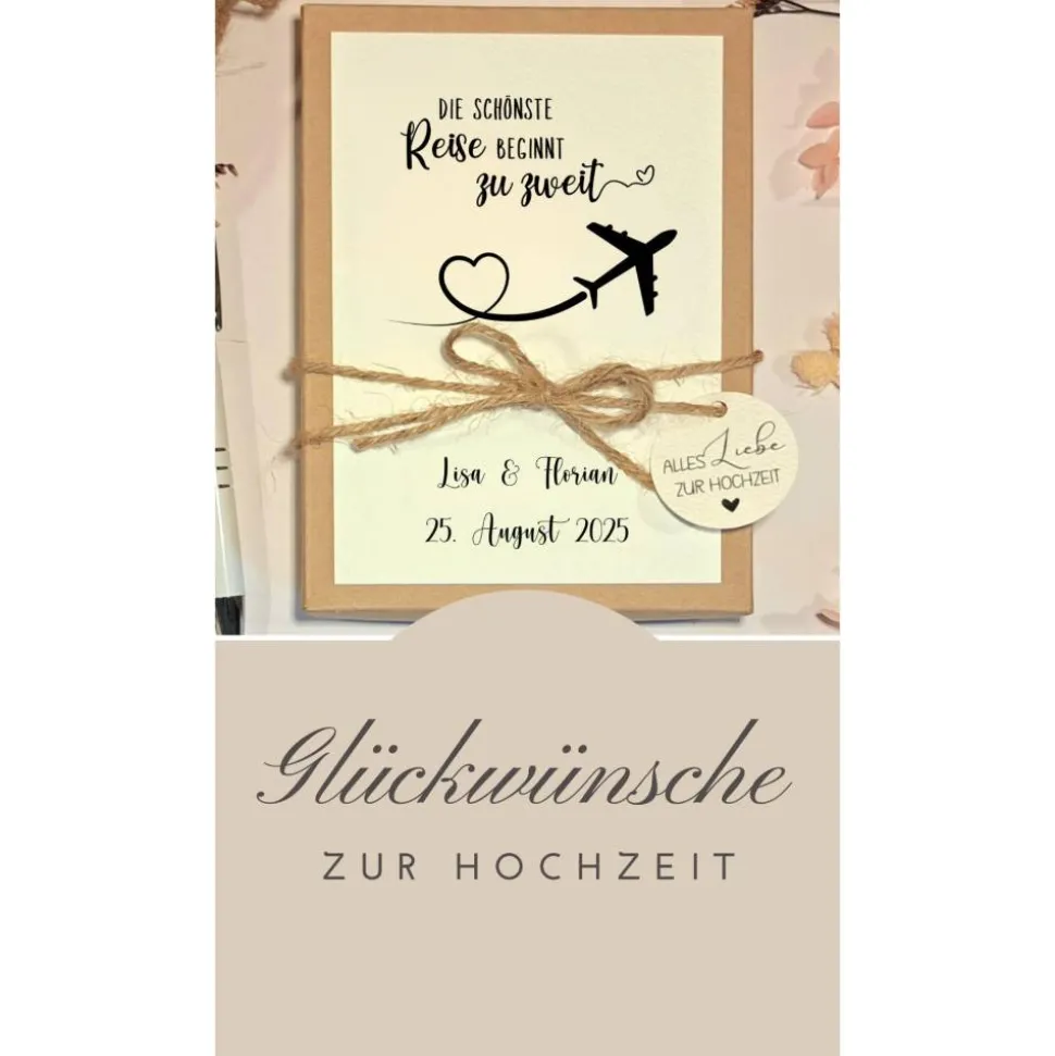 Die handgefertigte Geschenkbox „Die schönste Reise beginnt zu zweit“ ist nicht nur eine stilvolle Verpackung, sondern ein echtes Symbol für den gemeinsamen Start in die Ehe. Perfekt für Paare mit Fernweh oder geplanten Flitterwochen, begeistert die Box mit liebevollem Spruch, Flugzeugmotiv und Herzlinie.