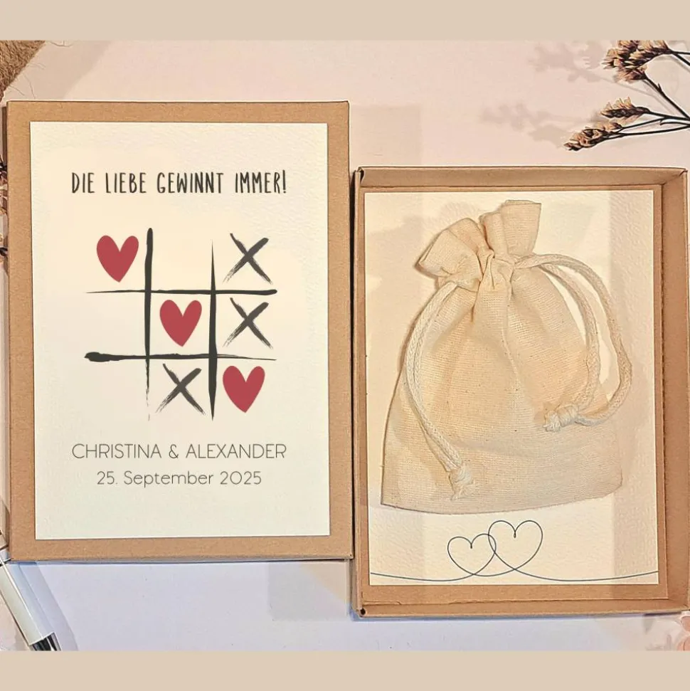 Du suchst ein originelles Geldgeschenk zur Hochzeit? Mit dieser handgefertigten Geschenkbox „Die Liebe gewinnt immer!“ schenkst du nicht nur Geld, sondern bleibende Erinnerungen. Die hochwertige, naturbraune Geschenkbox (11,5 x 15,5 x 2,5 cm) ist liebevoll gestaltet im stilvollen Tic Tac Toe-Design – mit Herzen, die zeigen, dass die Liebe immer siegt.