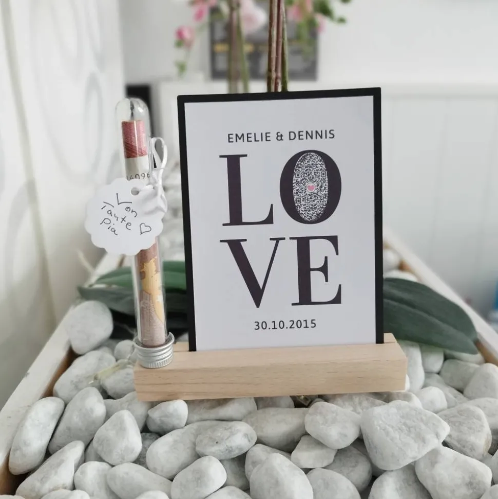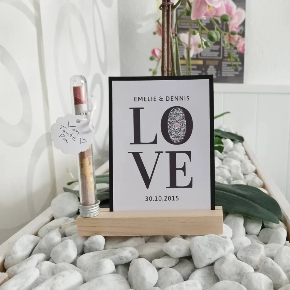 Schreibe die erste Bewertung für „Geldgeschenk Hochzeit | QrCode Geschenkkarte inkl. Reagenzglas und Kartenständern | Verliebt Verlobt Verheiratet | LOVE“ Antworten abbrechen