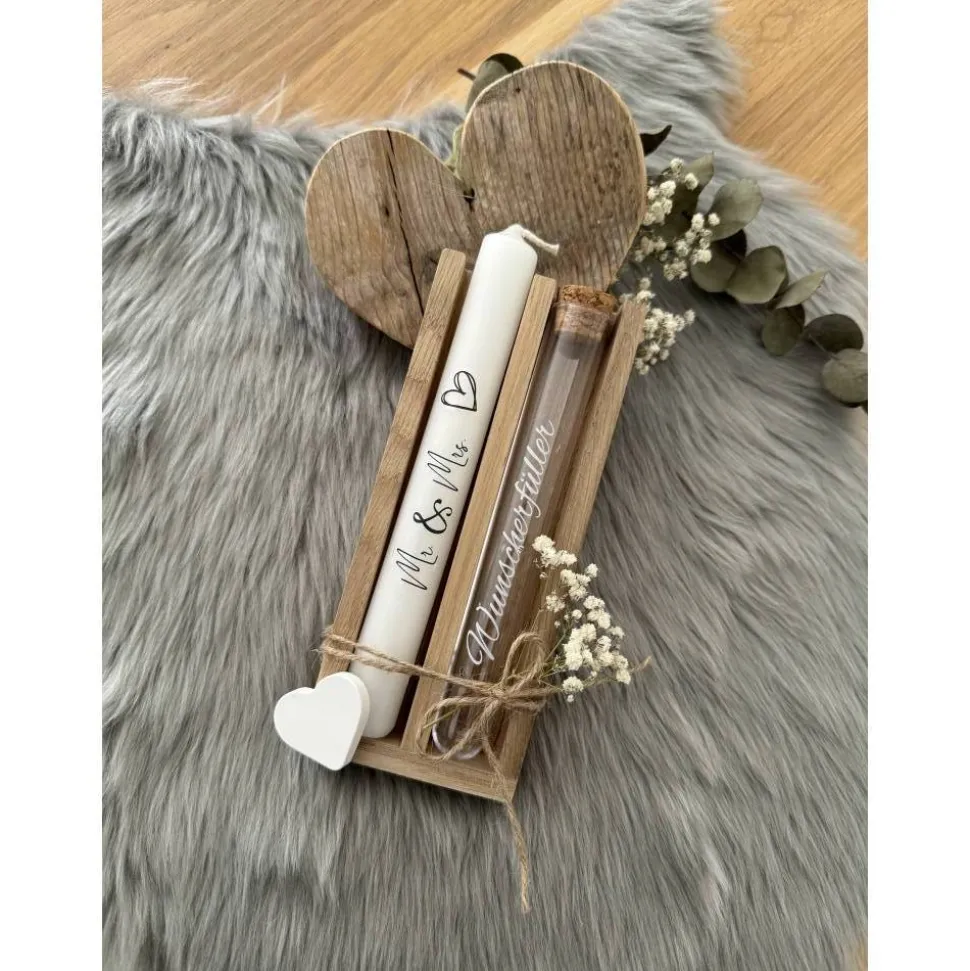– weißer Stabkerze (Durchmesser 22 mm) mit Beschriftung zum Thema Hochzeit