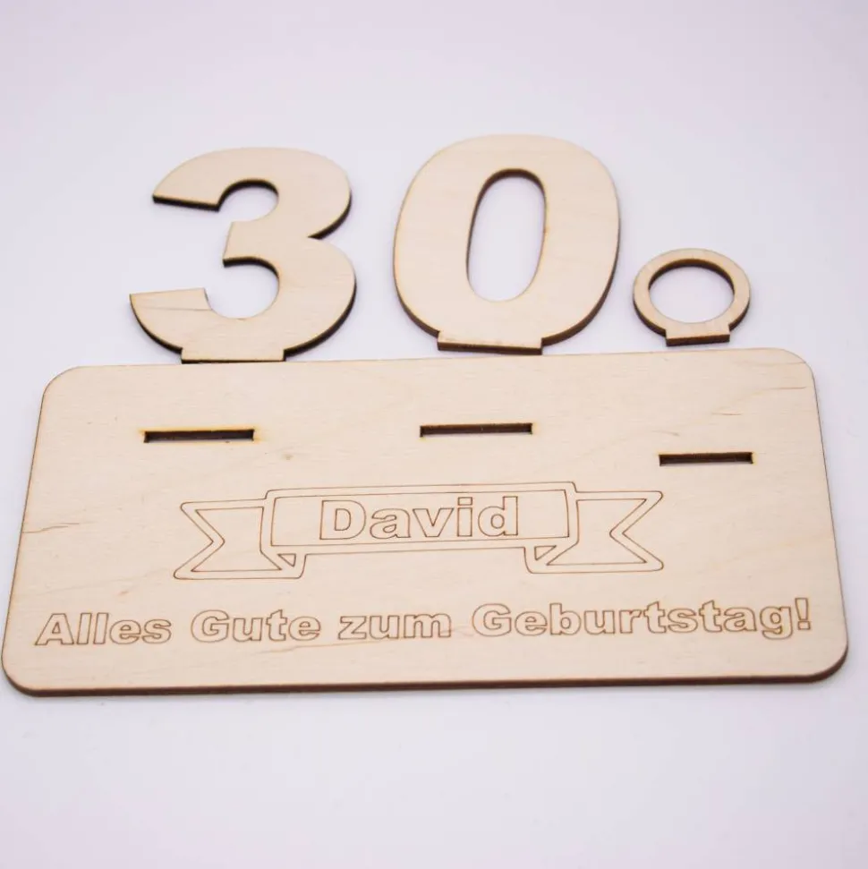 Unsere Lasergravurtechnologie ermöglicht es, kreative Designs, maßgeschneiderte Botschaften und persönliche Details auf das Holz zu übertragen. Dadurch wird jedes Geldgeschenk zu einem einzigartigen Unikat, das von Herzen kommt. Die Präzision der Gravur sorgt dafür, dass jedes Detail gestochen scharf und beeindruckend dargestellt wird.Ihr könnt auch gerne andere Zahlen eintragen zum Beispiel 44 oder 37.Auf den Bildern sind nur Vorschläge, diese können aber jederzeit geändert werden.Gebt dann einfach bei der Bestellung den Name und die benötigte Zahl an.