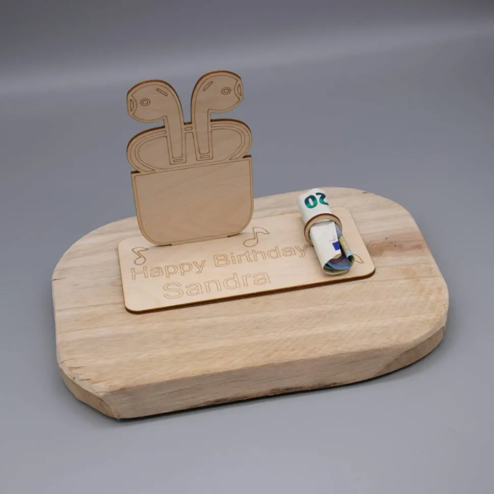 Unser Geldgeschenk aus 3 mm Birkensperrholz bietet nicht nur eine stilvolle Präsentation für Geldscheine, sondern kann auch als dekoratives Element in jedem Zuhause dienen. Es kann an der Wand aufgehängt oder auf einem Regal platziert werden, um eine wunderbare Erinnerung an den besonderen Anlass zu schaffen.
