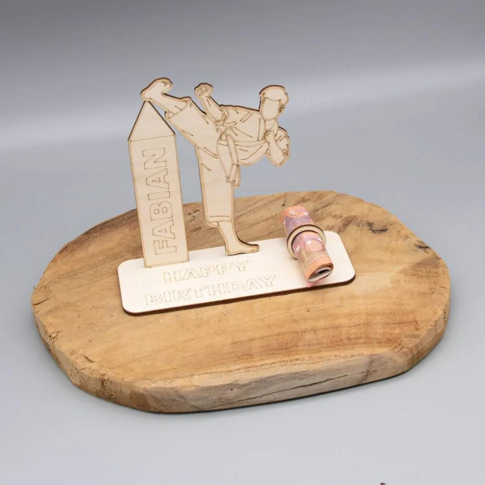 Überraschen Sie den Karate-Enthusiasten in Ihrem Leben mit diesem meisterhaft gefertigten, personalisierten Geldgeschenk aus Holz. Es ist nicht nur eine elegante Möglichkeit, ein Geldgeschenk zu überreichen, sondern auch ein Andenken, das mit Liebe und Respekt für die Kunst des Karate gefertigt wurde.
