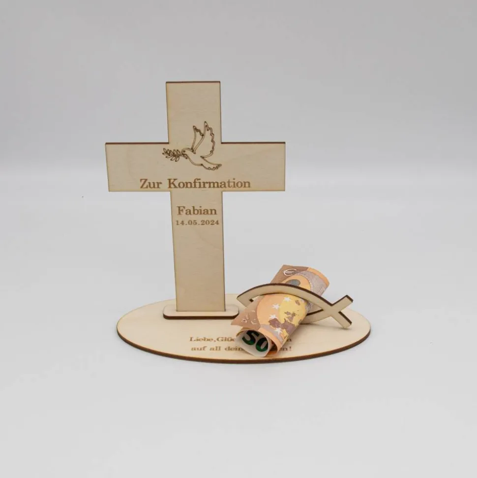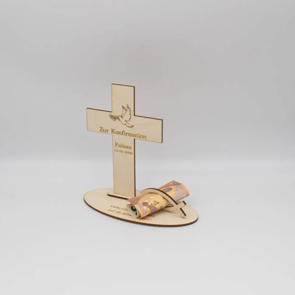 Geldgeschenk Konfirmation – Kreuz – aus Holz personalisiert