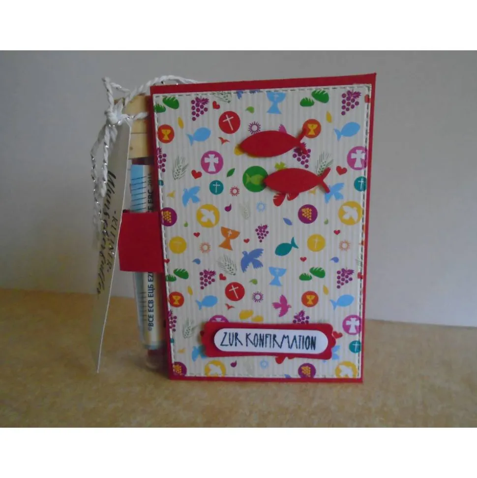 Verziert wurde diese Geldkarte zur Konfirmation für ein Mädchen mit Reagenzglas, Kreuz…