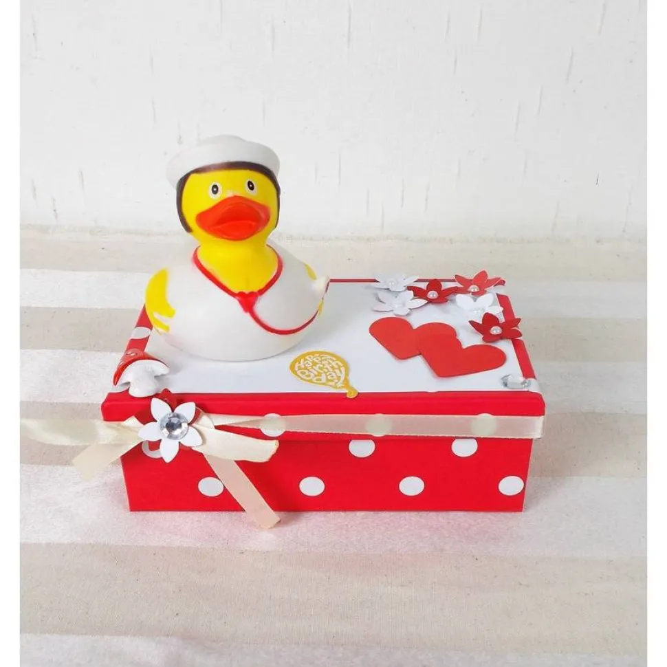 Auf die süße Box wurde eine niedliche Quietscheente als Krankenschwester aufgesetzt und das Ganze liebevoll dekoriert.