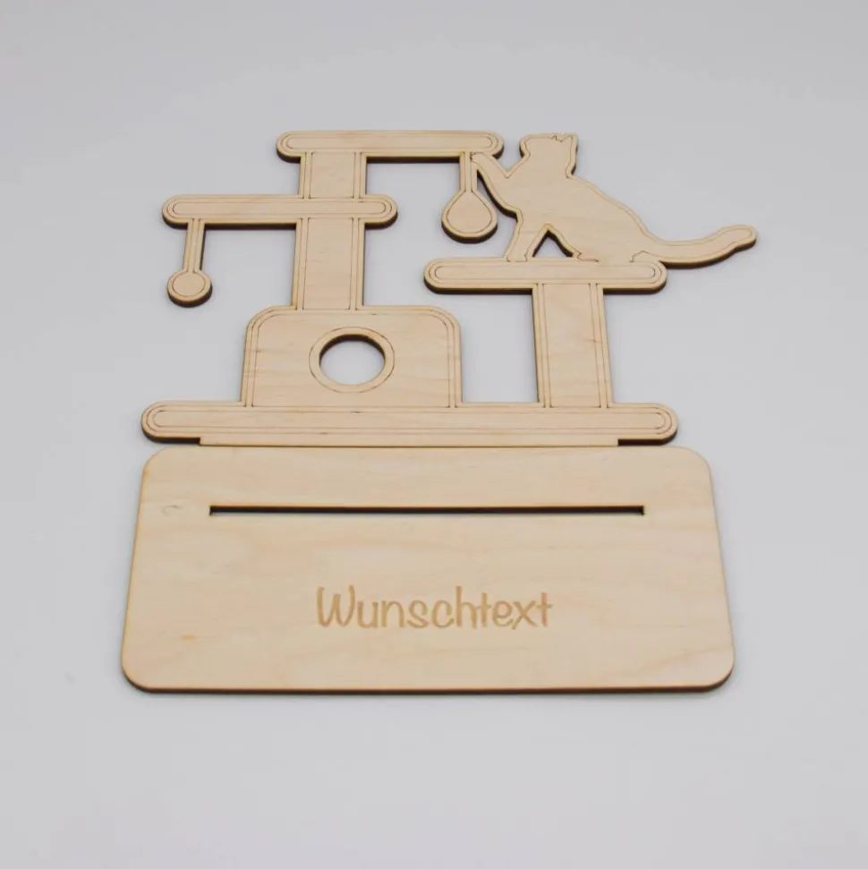 Geldgeschenk Kratzbaum/Katze – aus Holz personalisiert