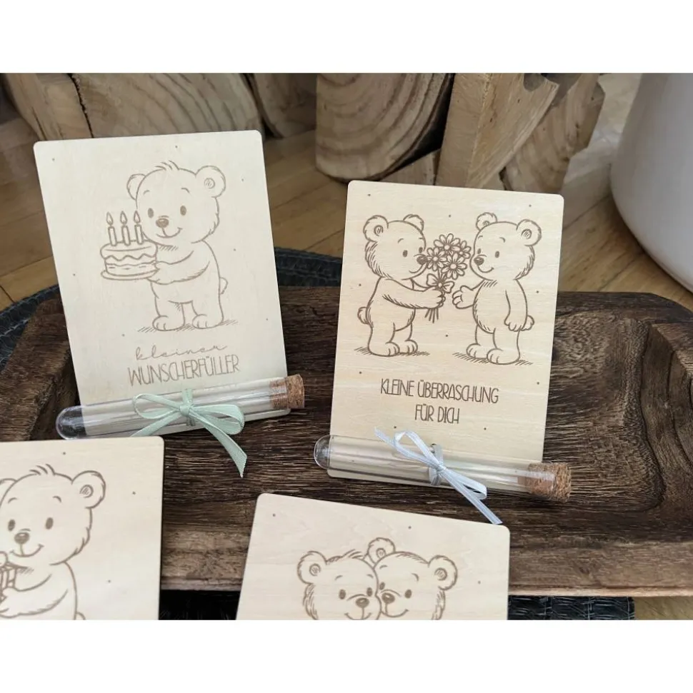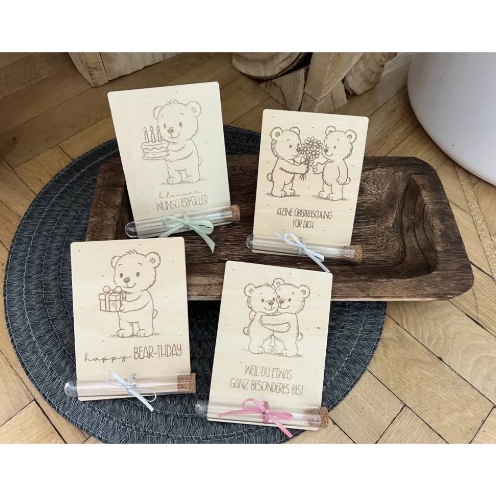 Mit dieser liebevoll gestalteten Geschenkkarte aus 3mm Birkenholz wird jedes Geldgeschenk zu einem echten Highlight. Die niedlichen Bärchen-Motive zaubern nicht nur Kindern ein Lächeln ins Gesicht, sondern begeistern auch Erwachsene und machen dein Präsent unvergesslich.