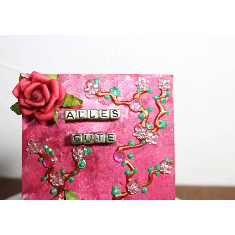 Witzige, künstlerische Gestaltung auf einer, mit Leinwand bezogenen, Malplatte. Gestaltet mit Acrylfarbe, Kunstblumen und Glitzersteinen. Mit Buchstabenwürfeln ist der Schriftzug ALLES GUTE auf der Malplatte angebracht. Als Staffelei wird hier ein kleiner Leiterwagen verwendet. Die Malplatte ist mit einer Klammer am Leiterwagen befestigt. Im Leiterwagen kann man Geldscheine, kleine Briefe, Gutscheine oder kleine Geschenke platzieren, siehe Beispielfoto .