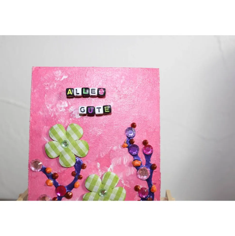 Witzige, künstlerische Gestaltung auf einer, mit Leinwand bezogenen, Malplatte. Gestaltet mit Acrylfarbe, Stoffblumen und Glitzersteinen. Mit Buchstabenwürfeln ist der Schriftzug ALLES GUTE auf der Malplatte angebracht. Als Staffelei wird hier ein kleiner Leiterwagen verwendet. Die Malplatte ist mit einer Klammer am Leiterwagen befestigt. Im Leiterwagen kann man Geldscheine, kleine Briefe, Gutscheine oder kleine Geschenke platzieren, siehe Beispielfoto .