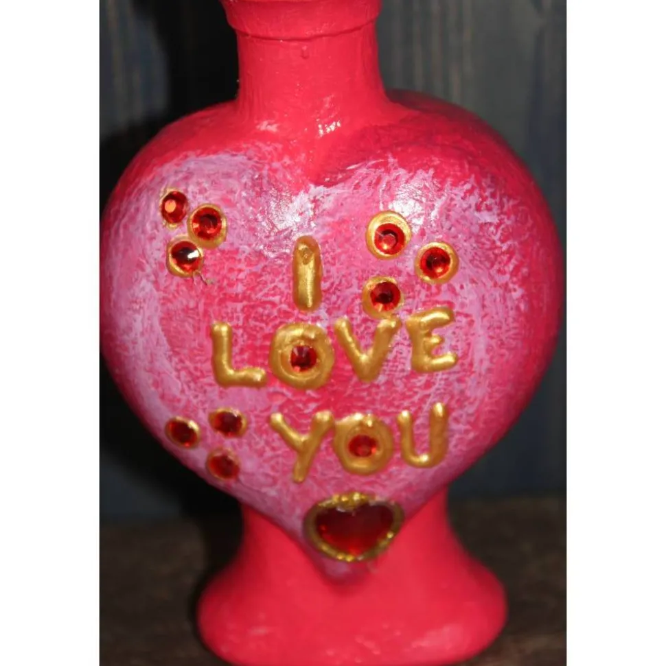 Witzige Gestaltung aus einer herzförmigen Glasflasche. Upcycling-Projekt, gestaltet mit Acrylfarbe und Glitzersteinen. Kann als Geldgeschenk verwendet werden, indem man einen Geldschein oben in den Notizhalter klammert, siehe Beispielfoto. Auch für einen kleinen Liebesbrief oder Wellnessgutschein ist hier Platz :)!