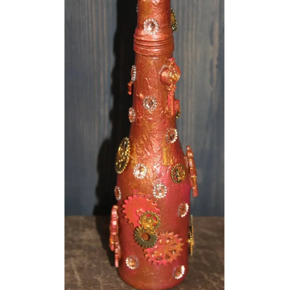 Witzige Gestaltung aus einer kleinen Glasflasche. Upcycling-Projekt, gestaltet mit Acrylfarbe im Steampunk-Stil. Dekoriert mit Glitzersteinen, Zahnrädern und Schlüsseln aus Kunststoff und Holz. Kann als Geldgeschenk verwendet werden, indem man einen Geldschein oben in den Notizhalter schiebt. Auch für einen kleinen Liebesbrief oder Wellnessgutschein in Scheckkartengröße ist hier Platz :)!