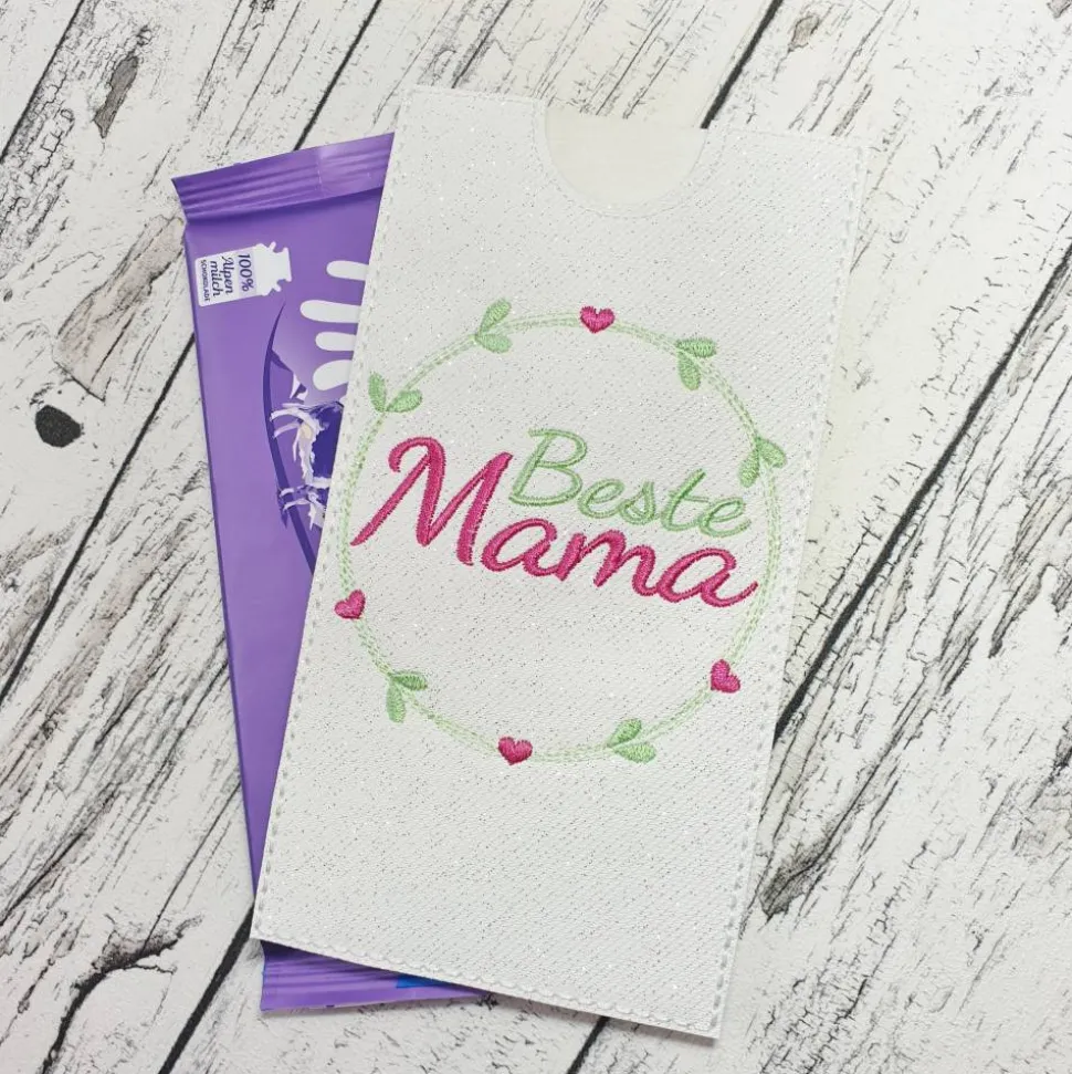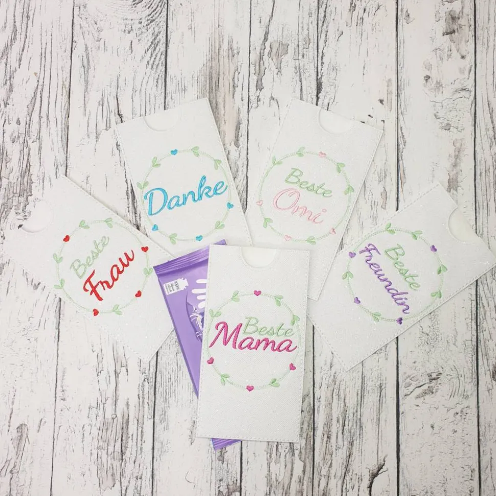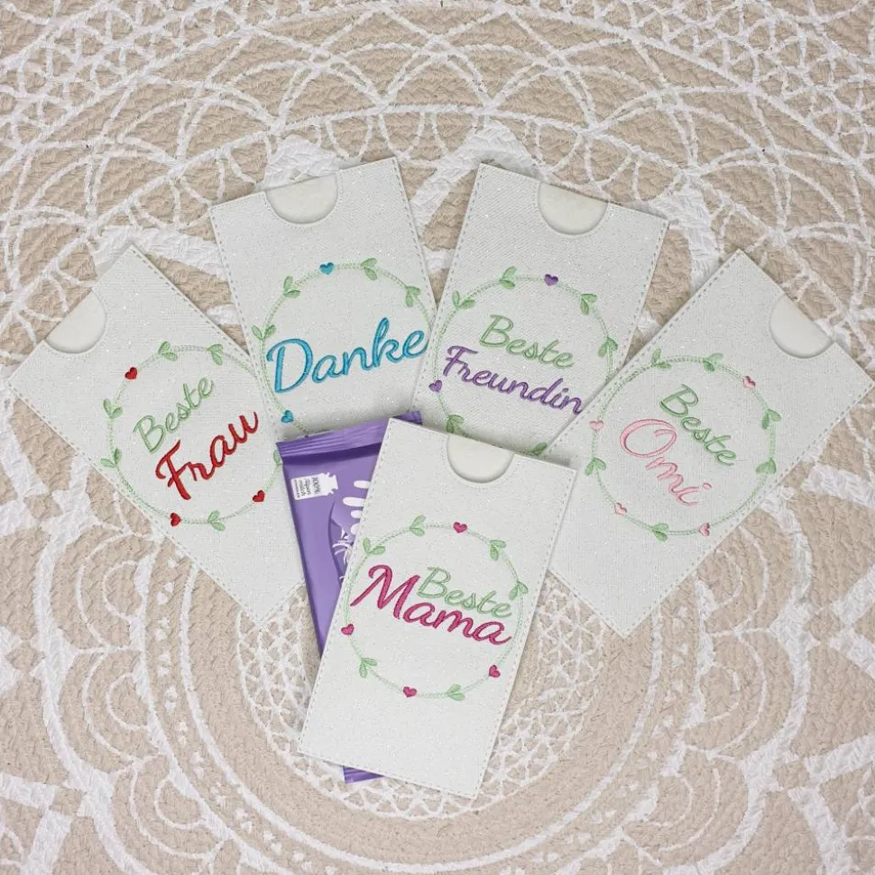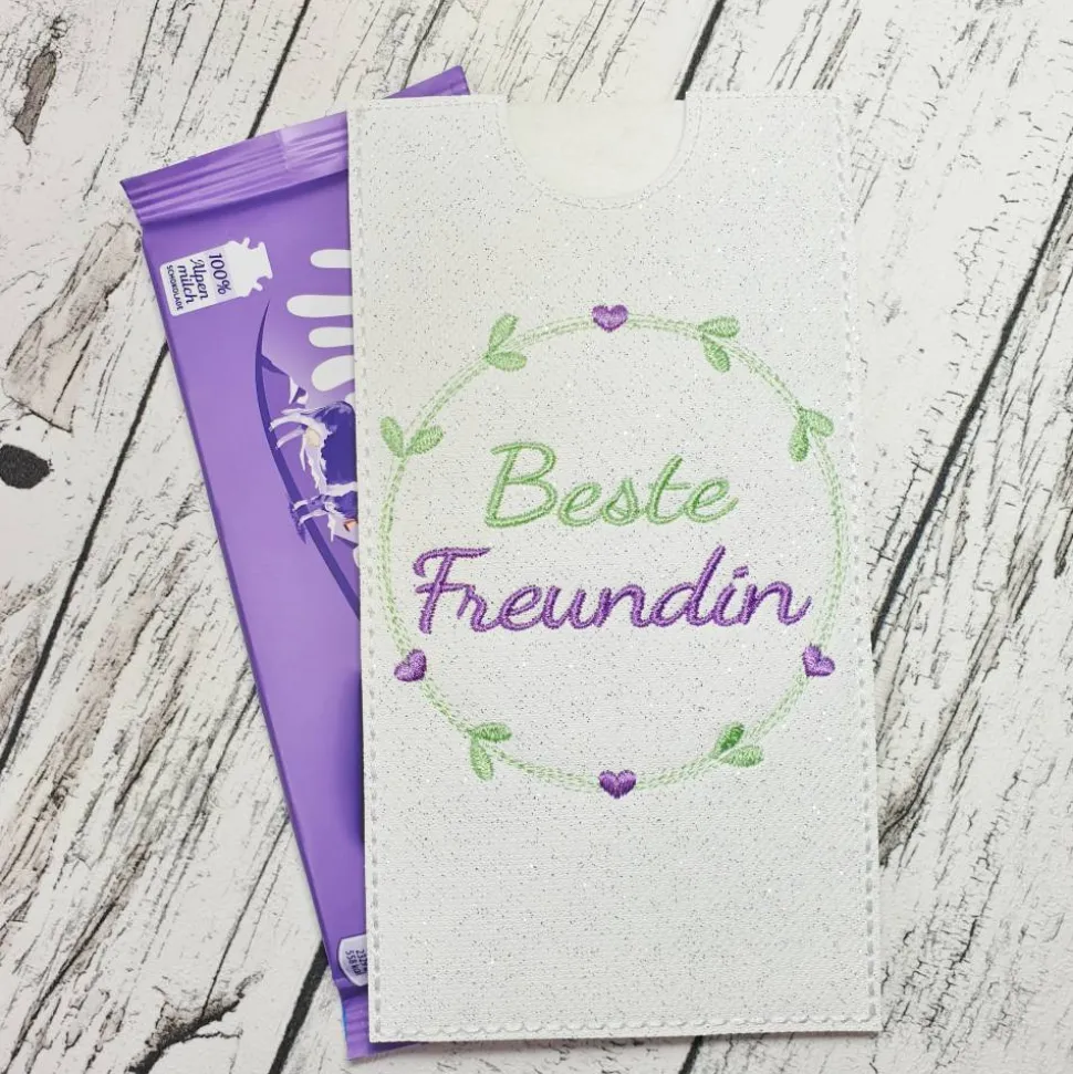 Die Hülle misst ca. 19cm x 9,5cm und ist konzipiert für eine 85 bis 100g Tafel Schokolade (gängige Schokoladengröße der beliebten Sorten wie Mil….a oder Alp..a), auch er Geldschein passt hier rein!