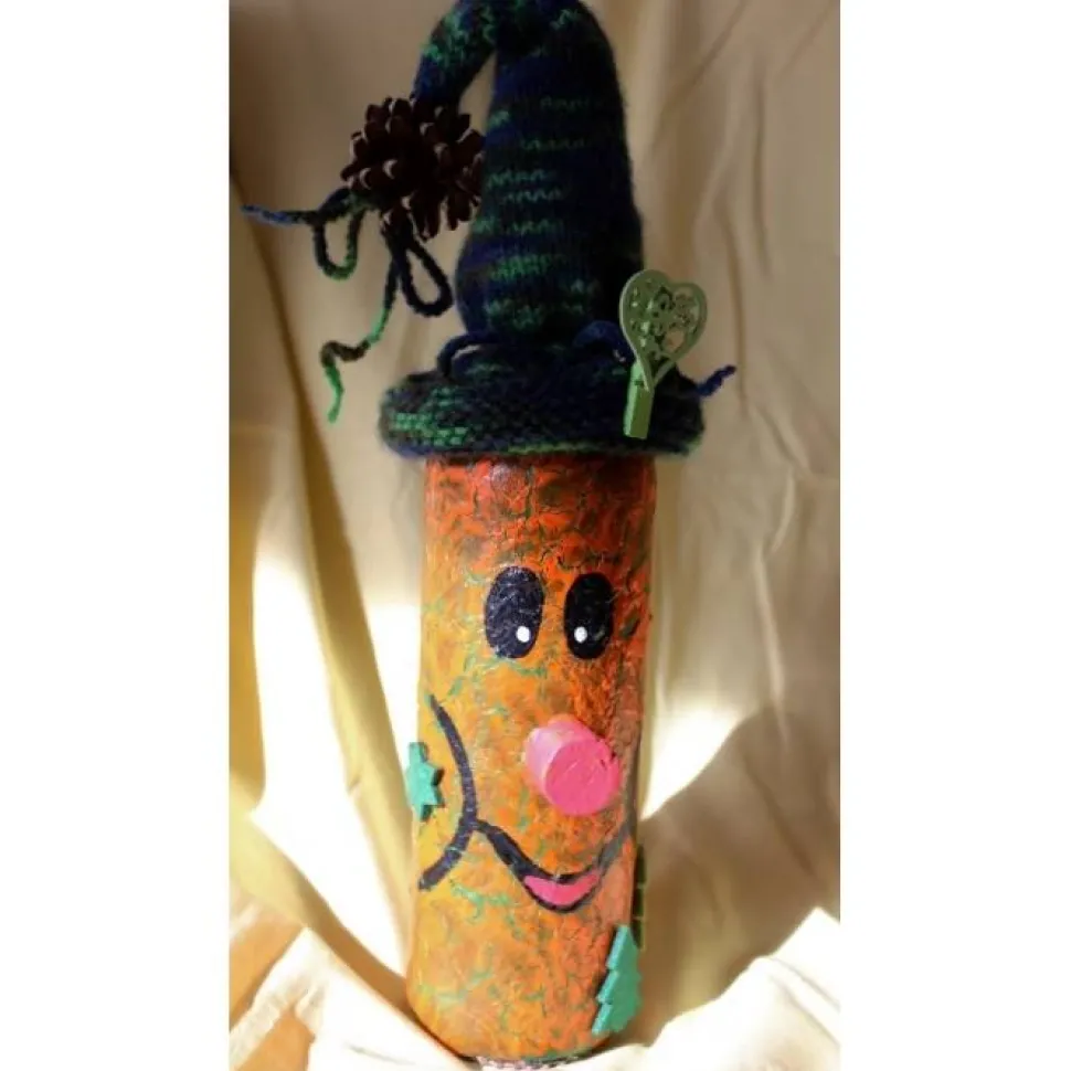 Dekofigur aus einer Glasflasche. Witziges Upcycling-Projekt, gestaltet mit Acrylfarbe und einem handgestrickten Wollmützchen. Verziert mit einem Zapfen, Filz und einer Holzklammer.