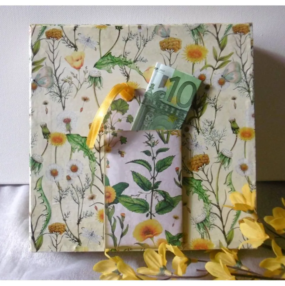 Auf der Rückseite der Box ist ein aus Designpapier gefertigter Umschlag befestigt in den Sie das zugedachte Geld bequem hinein geben können.