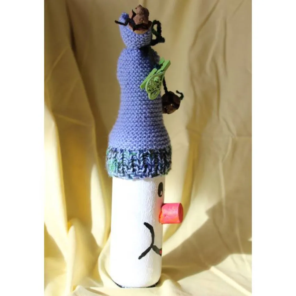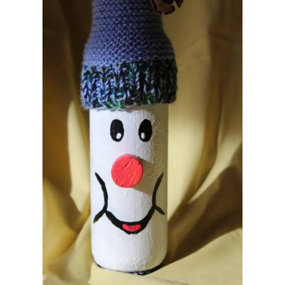 Schneemann aus einer Glasflasche. Witziges Upcycling-Projekt, gestaltet mit Acrylfarbe und einem handgestrickten Wollmützchen. Verziert mit Zapfen und einer Holzklammer. Kann als Geldgeschenk verwendet werden indem man einen Geldschein oder Gutschein an die Klammer zwickt :).