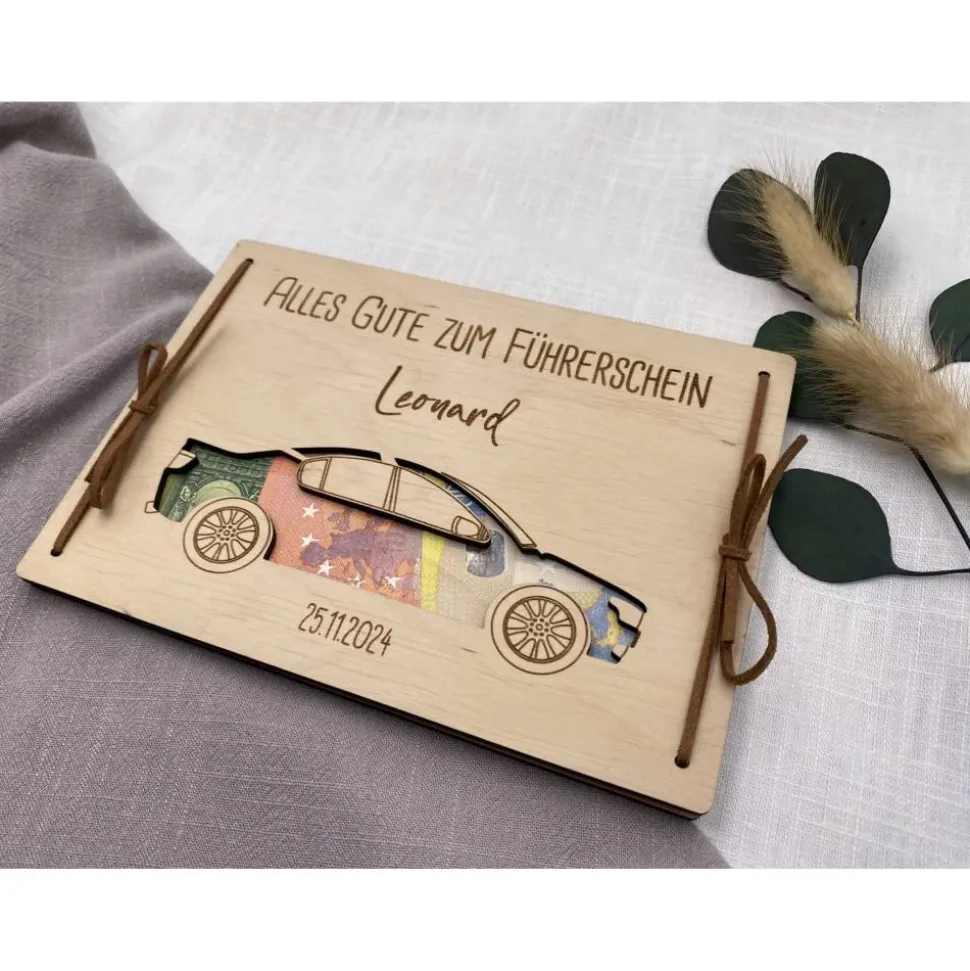 Für das Geldgeschenk nutzen wir 100% FSC zertifiziertes Pappelsperrholz, welches 3mm dick ist und wird inklusive Kunstlederband zum zubinden geliefert.