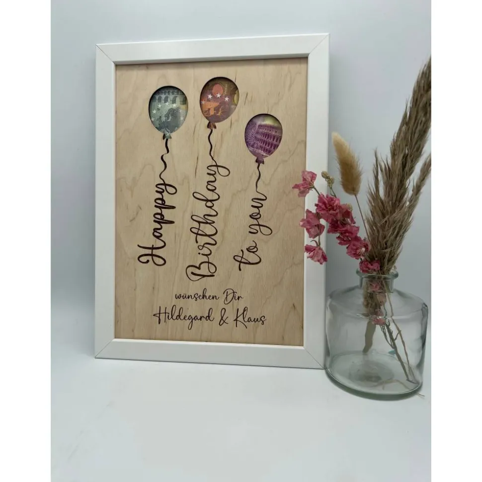 Der dekorative Rahmen bietet dir eine originelle Verpackung für Geldscheine, Gutscheine oder Tickets, die du ganz einfach hinter den liebevoll gestalteten Luftballons platzieren kannst. So wird dein Geschenk nicht nur persönlich, sondern auch zu einem einzigartigen Andenken.