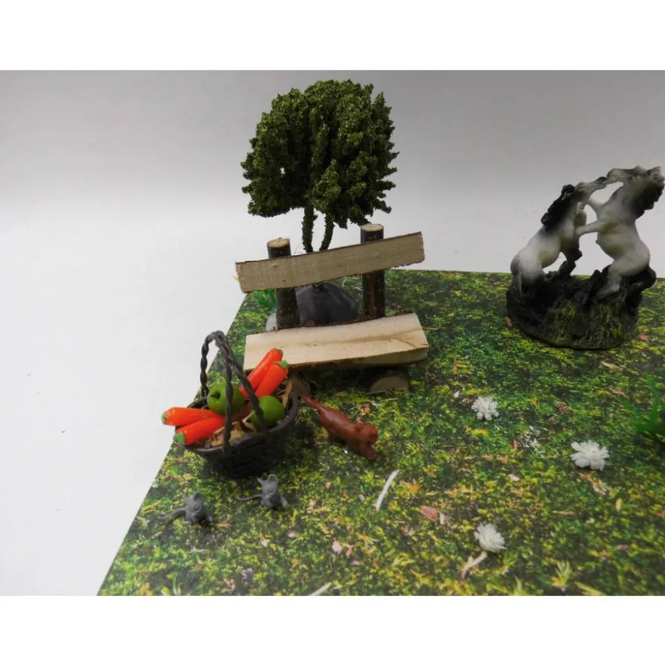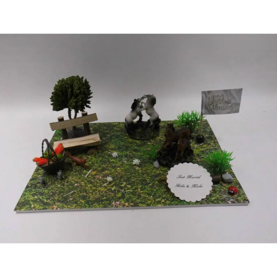 Überrasche einen Pferdeliebhaber mit einem einzigartigen Geldgeschenk zur Hochzeit oder zum Geburtstag! Diese liebevoll dekorierte Pferdekoppel bietet dir eine kreative Möglichkeit, Geldscheine originell zu verschenken. Der Leinwandkarton ist mit Rasenmotivpapier beklebt und mit vielen liebevollen Details wie Grasbüscheln, Blüten, einem Korb mit Gemüse, einer Katze und Mäusen sowie Pferdefiguren verziert. Die naturalistisch gestaltete Deko ist perfekt für Reiter und Pferdenarren.