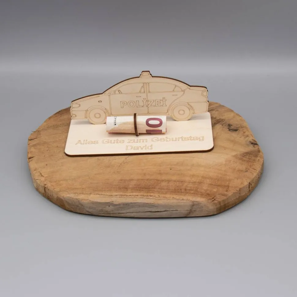 Geldgeschenk Polizeiauto - aus Holz personalisiert